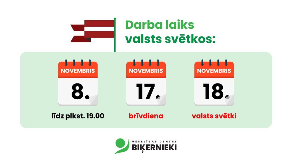 Pārceltajā darba dienā, 8. novembrī, veselības centra “Biķernieki” darba laiks būs līdz plkst. 19.00.