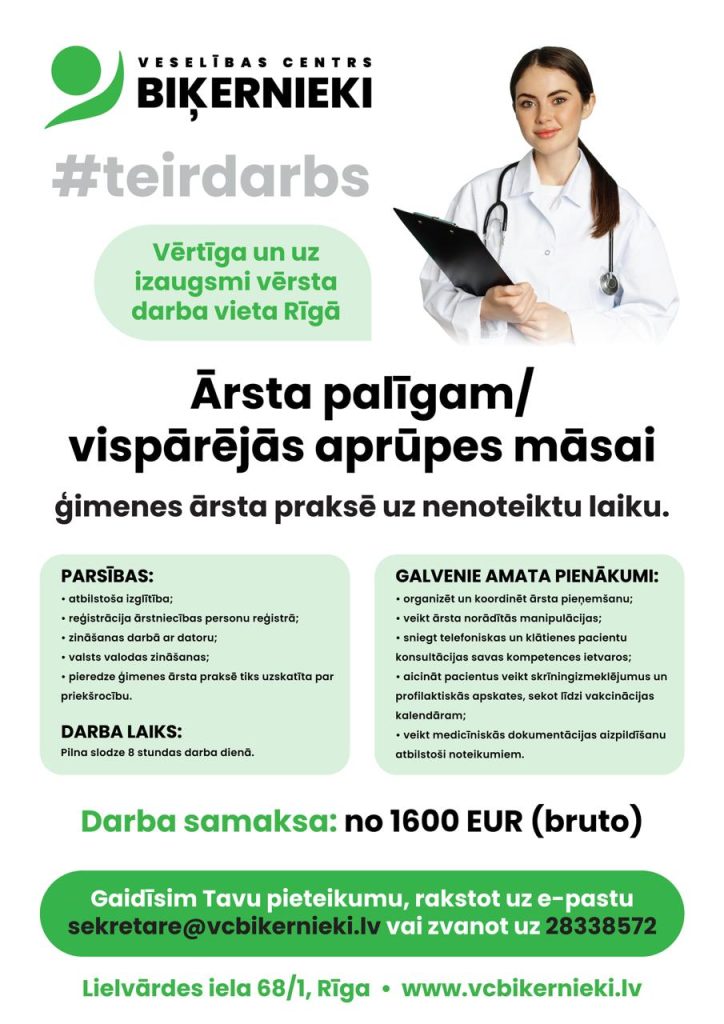 Veselības centrs “Biķernieki” aicina darbā ārsta palīgu vai vispārējās aprūpes māsu uz nenoteiktu laiku ģimenes ārsta praksē uz nenoteiktu laiku ar pilnu darba slodzi.