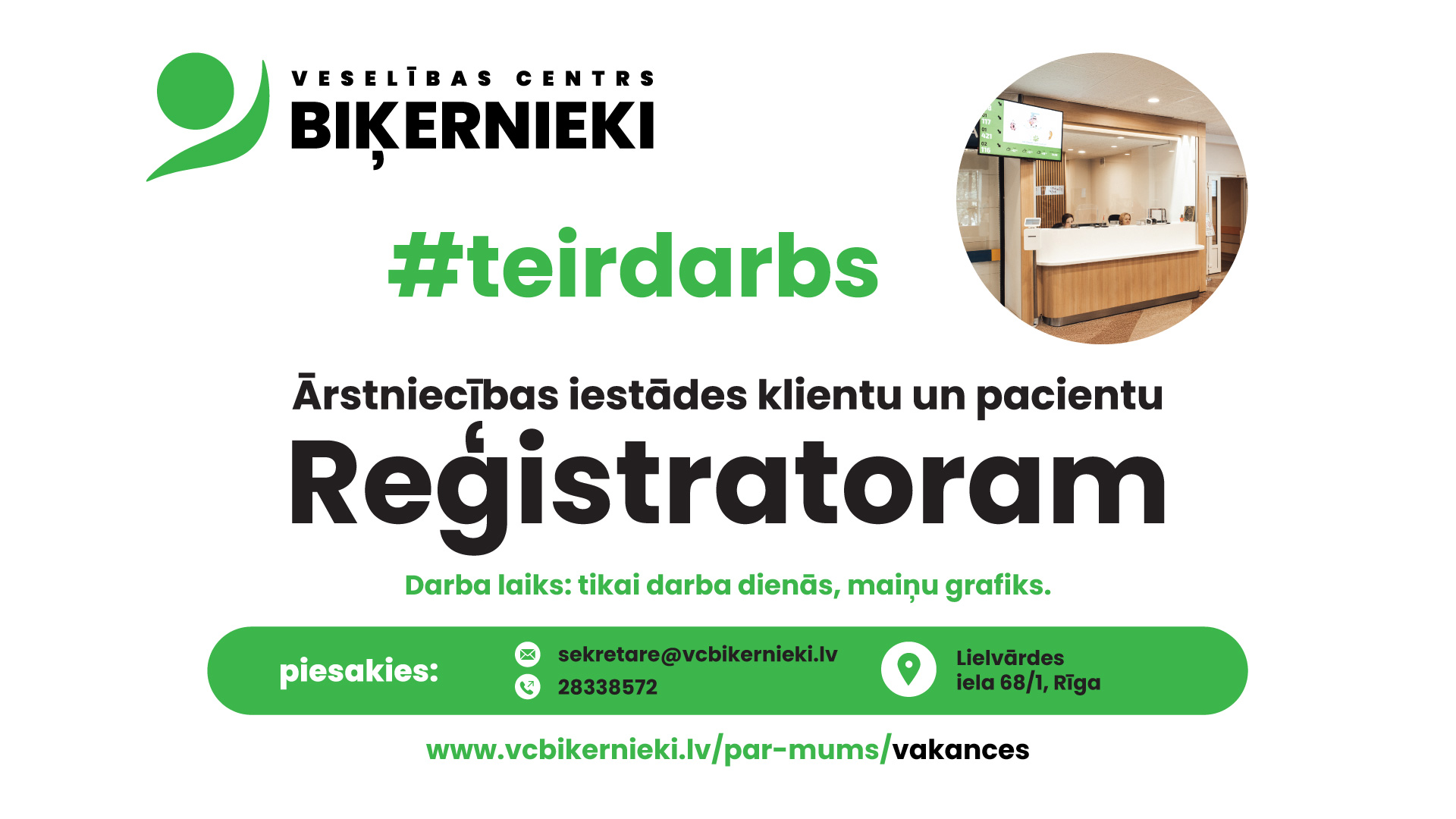 Veselības centrs “Biķernieki” aicina pievienoties savai profesionālajai komandai atsaucīgu, komunikablu un atbildīgu kolēģi – klientu un pacientu reģistratoru
